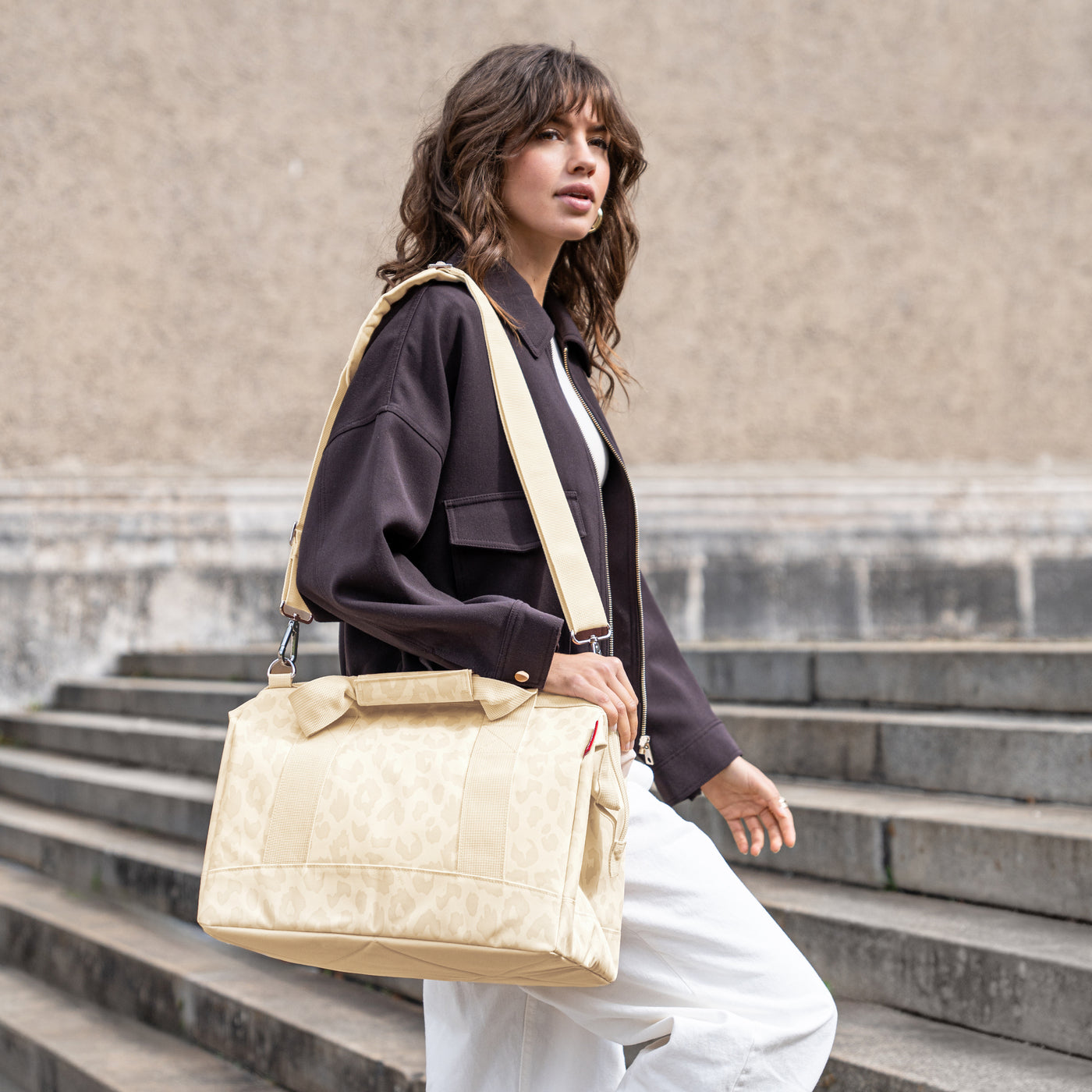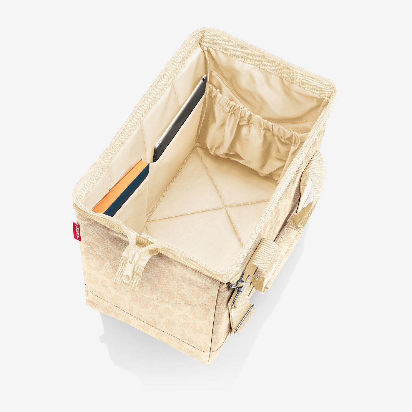 Opening with zip and integrated metal frame: The metal frame prevents the bag from closing, which is very practical when packing and using it.