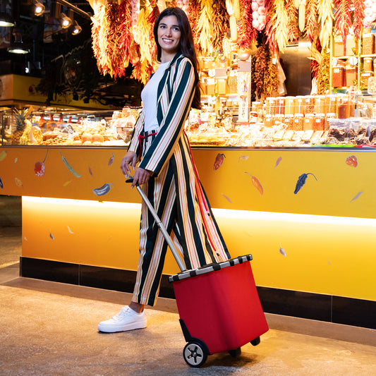 Transportar la compra, aperitivos y bebidas para un picnic o cosas para un día de excursión es un placer con el carrycruiser de reisenthel. Tiene una capacidad de 40 litros y puede transportar cómodamente 20 kilos, y se garantiza un buen agarre del carrycruiser: El elegante carro de la compra tiene una barra telescópica con asa en T que se puede extender en dos etapas. Las grandes ruedas con rodamientos de bolas permiten que el carrycruiser ruede suavemente, y cuando se toma un descanso, se mantiene estable sobre sus pies.Si no desea tirar del carrycruiser, simplemente retraiga la barra telescópica y llévelo sobre su hombro con la correa acolchada. Con el asa recogida, nuestro carro de la compra de poliéster hidrófugo también es ideal para guardarlo en el coche.